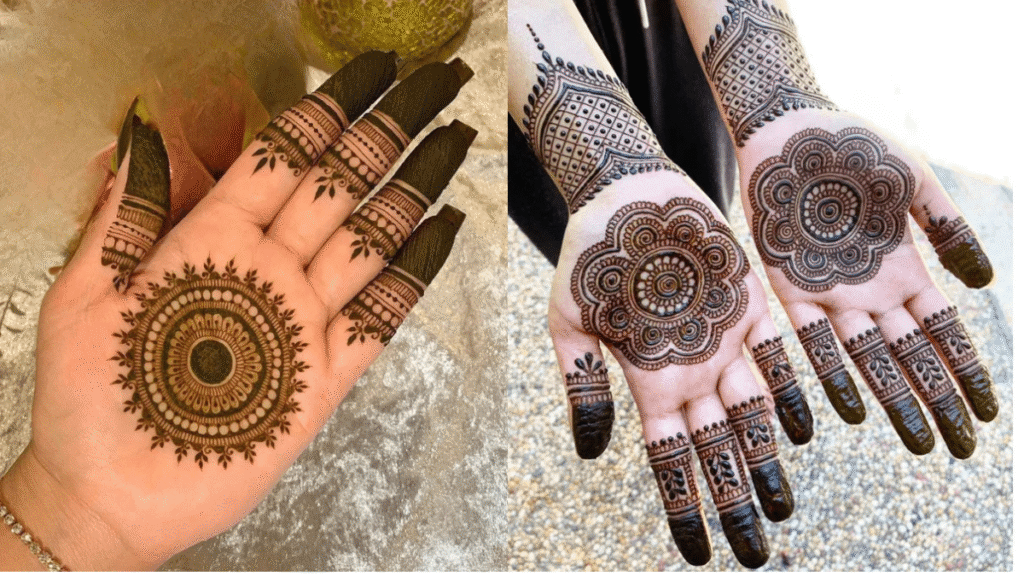 एक गोल पैटर्न को हथेली के बीच में बनाकर चारों ओर छोटे बिंदी पैटर्न या बारीक लाइनों से सजाना बहुत स्टाइलिश लगता है।