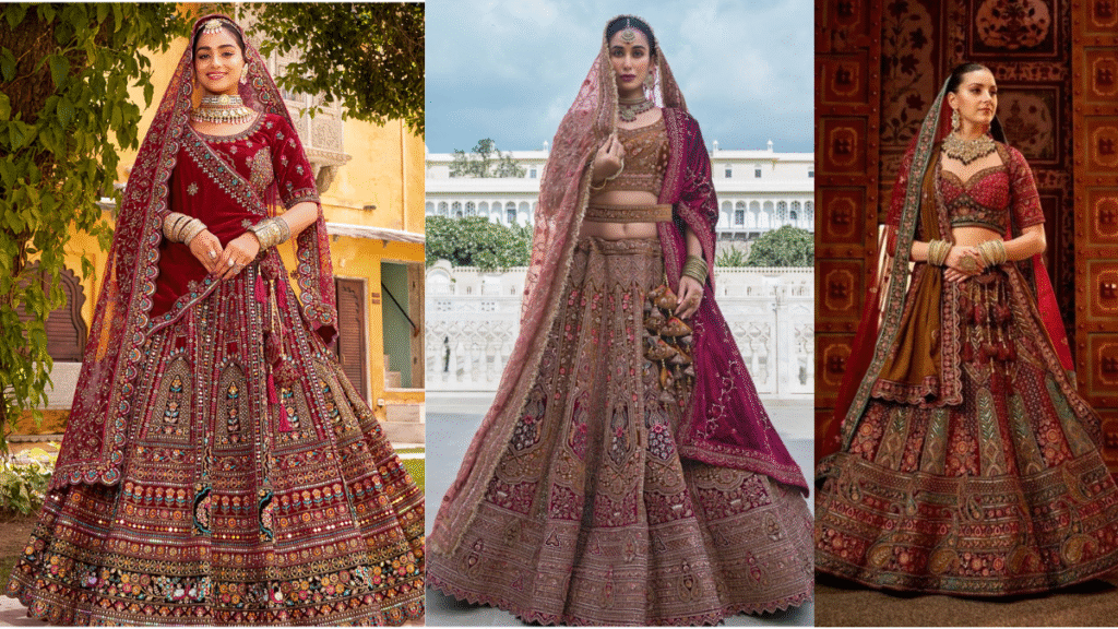 दिसंबर-जनवरी की शादियों के लिए डीप मारून, एमराल्ड ग्रीन और रॉयल ब्लू वेलवेट लहंगे बुकिंग में सबसे आगे हैं।